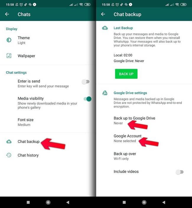 همچنین می‌توانید با لمس Backup to google drive مشخص کنید در چه بازه‌های زمانی از گفتگو‌های شما نسخه پشتیبان تهیه شود. همچنین با زدن تیک گزینه include videos می‌توانید مشخص کنید ویدیو‌ها شامل بکاپ گیری شوند یا خیر. در قسمت backup over می‌توانید مشخص کنید با استفاده از دیتا یا وای فای پشتیبان گرفته شود یا خیر.
