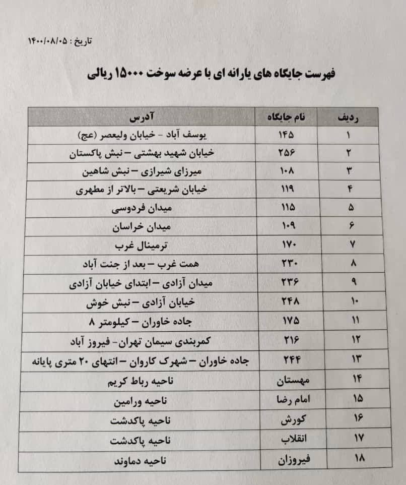 بر اساس این گزارش ،اسامی جایگاههای سوخت فعال در تهران که بنزین سهمیهای به خودروها عرضه میکنند به شرح جدول زیر است: