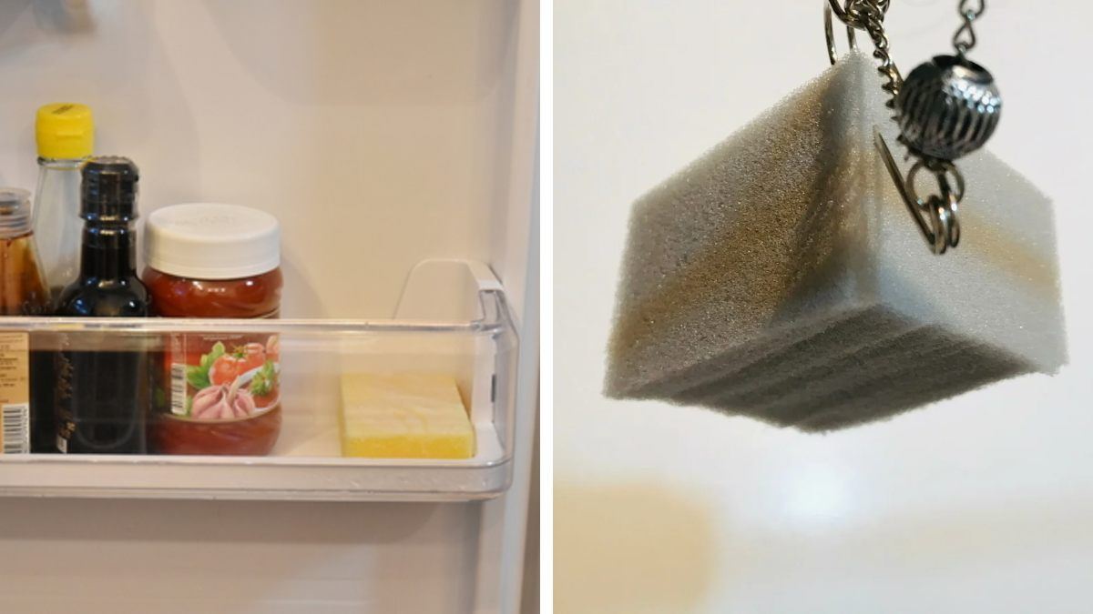 بوی نامطبوع یخچال را می توان با یک اسفنج معمولی از بین برد؛ روی آن جوش شیرین بپاشید و در درب یخچال قرار دهید. اگر می خواهید از شر دود سیگار نیز خلاص شوید، یک اسفنج را در مرکز اتاق (مثلاً روی لوستر) آویزان کنید.