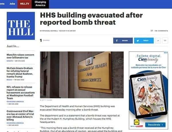 وبگاه کنگره آمریکا (هیل) در این خصوص اعلام کرد که ساختمان وزارت بهداشت و خدمات انسانی (HHS) صبح امروز پس از دریافت گزارش هایی مبنی بر تهدید به بمب گذاری از سوی نیروهای امنیتی و پلیس تخلیه شد.