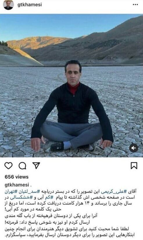 مکانی که علی کریمی روی آن نشسته و عکس انداخته، بخش‌های خشک شده از بستر دریاچه سد لتیان است که یکی از مهمترین و کلیدی‌ترین سد‌ها برای آبرسانی به پایتخت کشور به شمار می‌آید و افقی که از پشت سر او پیداست، نشان دهنده عمق بی آبی در سراسر ایران. موضوع نگرانی کننده‌ای که چالش اصلی دولتمردان است و خواهد بود.