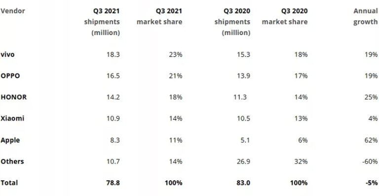در رتبهی پنجم هم شاهد قرارگیری اپل هستیم که با رشد سالانهی ۶۲ درصدی در سهماههی سوم ۲۰۲۱ حدود ۸٫۳ میلیون آیفون به دست کاربران چینی رسانده است. هواوی هم که روزی روزگاری در رتبهی اول این فهرست قرار داشت، حالا دیگر نام آن در بین ۵ شرکت بزرگ دیده نمیشود و طی این مدت حدود ۵ میلیون گوشی فروخته است.