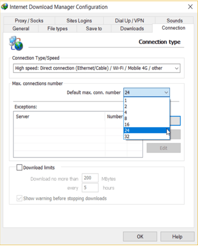ج) حال در بخش Default max. conn. Number منو کشویی را باز کنید. سپس عدد ۲۴ را انتخاب کنید.