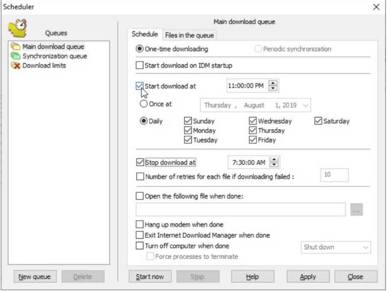 با استفاده از برنامه اینترنت دانلود منیجر شما میتوانید به راحتی برای هر دانلود خود یک زمان خاص تعیین کنید و یا حتی تمامی دانلودها را به یک ساعت خاص اختصاص دهید. این برنامه میتواند پس از دانلود فایلهای شما، به صورت خودکار اینترنت را خاموش کند و یا حتی به طور کامل رایانه شما را خاموش کند. برای مثال شما در نظر دارید که چندین فایل مختلف را دانلود کنید، اما در صورت دانلود این فایلها در روز، سرعت اینترنت شما به شدت کاهش پیدا میکند و شما دیگر نمیتوانید کارهای خود را در طی روز با اینترنت انجام دهید. در نتیجه شما با اینترنت دانلود منیجر تمامی دانلودها را به یک ساعت خاص از شب اختصاص میدهید و حالتی را فعال میکنید تا پس از اتمام دانلودها سیستم (رایانه) شما خاموش شود.