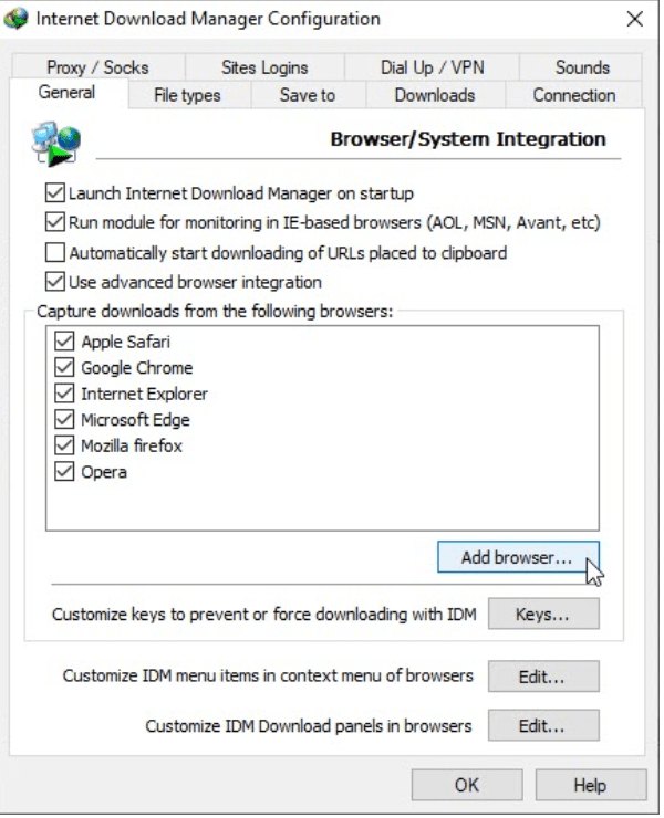 IDM از مرورگرهای محبوب همچون گوگل کروم، موزیلا فایرفاکس، اپرا، مایکروسافت اج و… پشتیبانی میکند. همچنین اگر با مرورگر خاصی کار میکنید، میتوانید آن را به اینترنت دانلود منیجر اضافه کنید. مراحل آن به صورت زیر است که باید به ترتیب اجرا کنید: