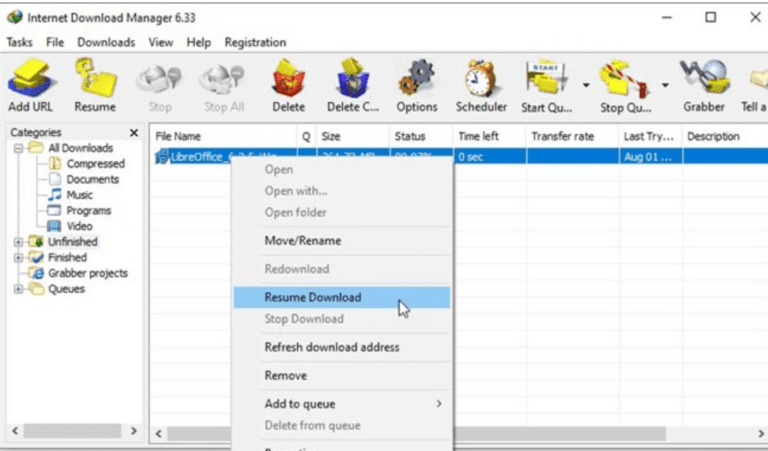 اینترنت دانلود منیجر در صورت بروز هر مشکلی، فایل دانلودی شما را نگه میدارد و پس از رفع مشکل، ادامه دانلود را انجام میدهد. اگر این کار به صورت خودکار انجام نشد، باید روی مورد دانلودی خود راست کلیک کنید و گزینه Refresh Download Address را انتخاب کنید. به این صورت دانلود شما ادامه پیدا میکند و نگرانی پاکشدن فایل دانلودی در حین قطعی اینترنت یا موارد دیگر را نخواهید داشت.