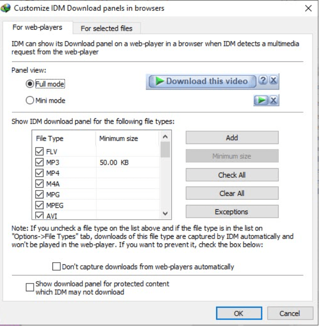 شما میتوانید پنل نمایشی دانلود را به مرورگر اضافه کنید. اینترنت دانلود منیجر میتواند زمانی که فایلهای چند رسانهای برای دانلود شناسایی میکند، پنل دانلود را در مرورگر به شما نمایش دهد. این پنل میتواند به صورت Full یا Mini نمایش دادهشود. همچنین شما میتوانید برای اینترنت دانلود منیجر تعیین کنید که برای چه فایلهایی پنل دانلود را به شما نمایش دهد. همچنین شما میتوانید به صورت دلخواه هر زمانی که بخواهید، این پنل را از روی مرورگر غیرفعال کنید تا دیگر پنل برای شما نمایش داده نشود.