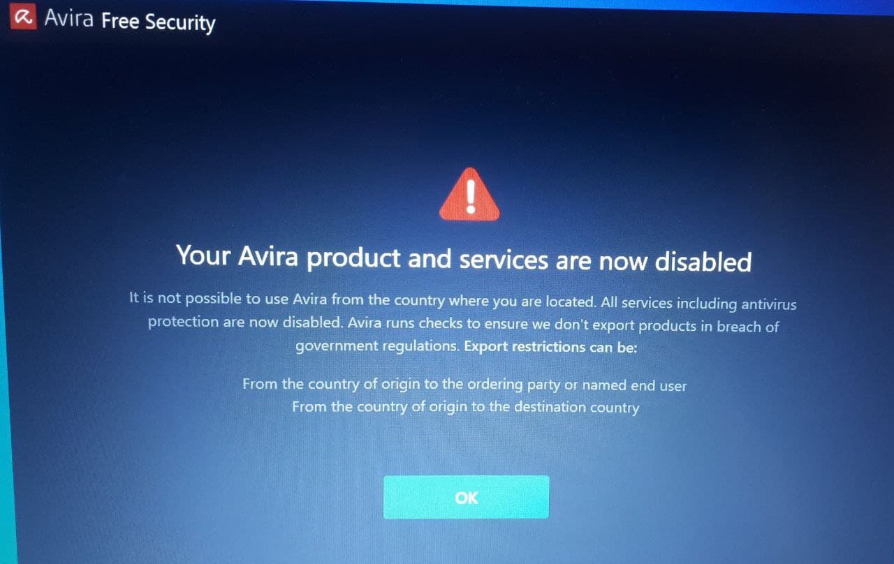علت پایان ارائه خدمات به کاربران کشورهای تحریمی، قرار گرفتن Avira تحت تملک شرکت آمریکایی NortonLifeLock عنوان شده است که زین پس بایستی مطابق با مقررات تحریم ایالات متحده آمریکا عمل کند: