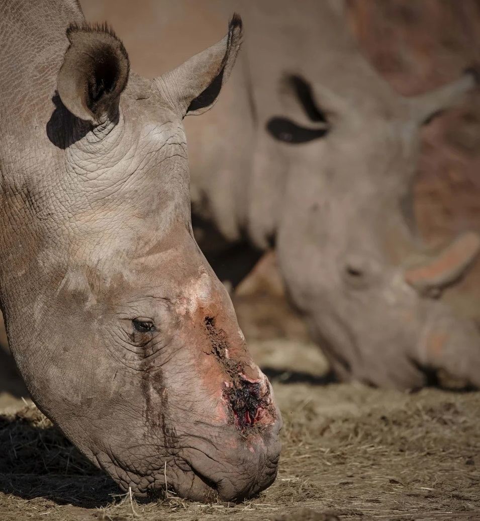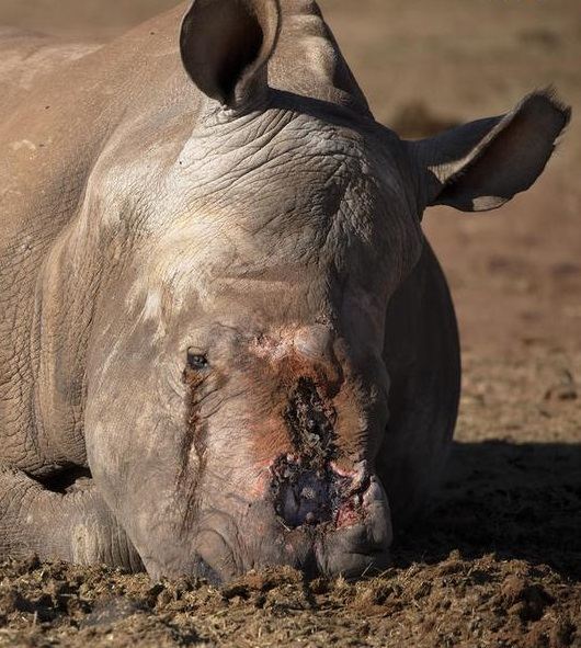 یک کرگدن که شاخش توسط شکارچیان غیرقانونی بریده شده از شدت درد گریه می‌کند و آثار اشک خشک شده بر چهره اش نمایان است.