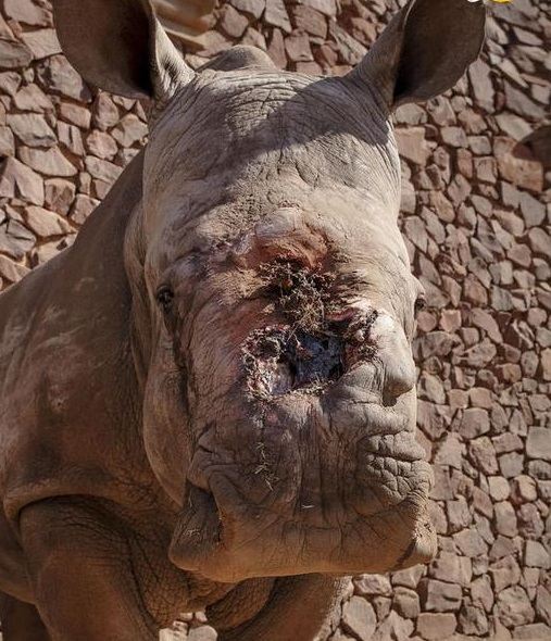 در عکس‌ها مشاهده می‌شود که شاخ کرگدن از انتها بریده شده و استخوان جمجمه اش قابل دیدن است.