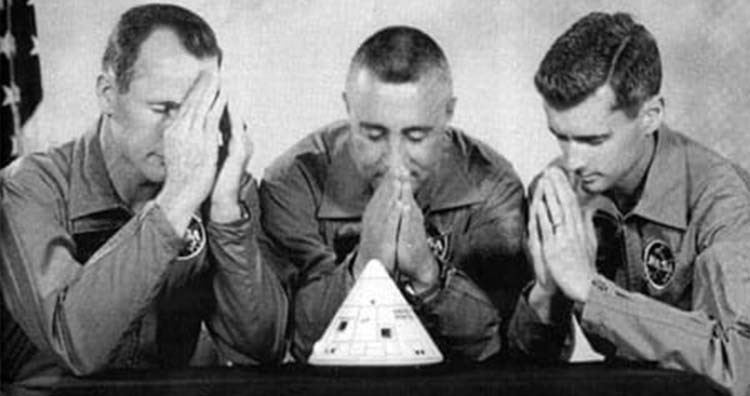 خدمه فضاپیمای آپولو ۱ در ۱۹ آگوست ۱۹۶۶ درباره ساخت ماژول فرماندهی ابراز نگرانی کردند. این عکس، هر سه فضانورد را نشان میدهد که در آن زمان به شوخی برای سفر ایمن خود به فضا دعا میکنند. البته فضاپیما بعداً آتش گرفت و هر سه فضانورد کشته شدند. این گروه در آن حادثه احتمالاً از حال رفته و بر اثر خفگی ناشی از تنفس گازهای سمی جان خود را از دست داده اند. تلاش برای بیرون آوردن این افراد از فضاپیمای سوخته تا شش ساعت پس از آتش سوزی شروع نشد و بعد از آن هم یک ساعت و نیم طول کشید تا اجساد خارج شوند.