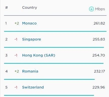 در سطح اینترنت ثابت جهان موناکو با دو پله صعود، پرسرعت‌ترین اینترنت را در اختیار شهروندانش قرار می‌دهد و کاربران اینترنت با سرعت 261.82 مگابایت‌برثانیه را تجربه می‌کنند. در رتبه دوم سنگاپور با سرعت 255.83 مگابایت‌برثانیه قرار گرفته است و در رتبه سوم هم هنگ‌کنگ با سرعت 254.70 مگابایت‌برثانیه به چشم می‌خورد. در جایگاه‌های چهارم و پنجم هم به‌ترتیب رومانی و سوئیس قرار دارند.