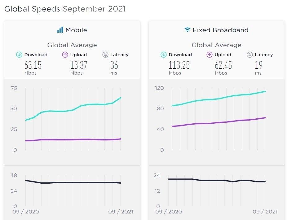 به گزارش سایت طلا ، بر اساس گزارش ماهانه سپتامبر 2021 اسپیدتست (SpeedTest)، میانگین سرعت اینترنت ثابت و موبایل در جهان افزایش پیدا کرده که این افزایش برای اینترنت موبایل قابل‌توجه‌تر است. سرعت اینترنت موبایل در گزارش ماه آگوست برابر 56.74 مگابایت‌برثانیه بود، اما حالا با افزایش بیش از 6مگابایتی به 63.15 مگابایت‌برثانیه رسیده است.