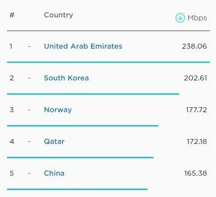 در سطح جهان تغییری در رتبه‌های اول تا پنجم ایجاد نشده است و هنوز امارات متحده عربی بالاترین سرعت را در اختیار شهروندانش قرار می‌دهد. سرعت اینترنت موبایل در این کشور به 238.06 مگابایت‌برثانیه می‌رسد که بسیار بالاتر از کره جنوبی با سرعت 202.61 مگابایت در مقام دوم است.