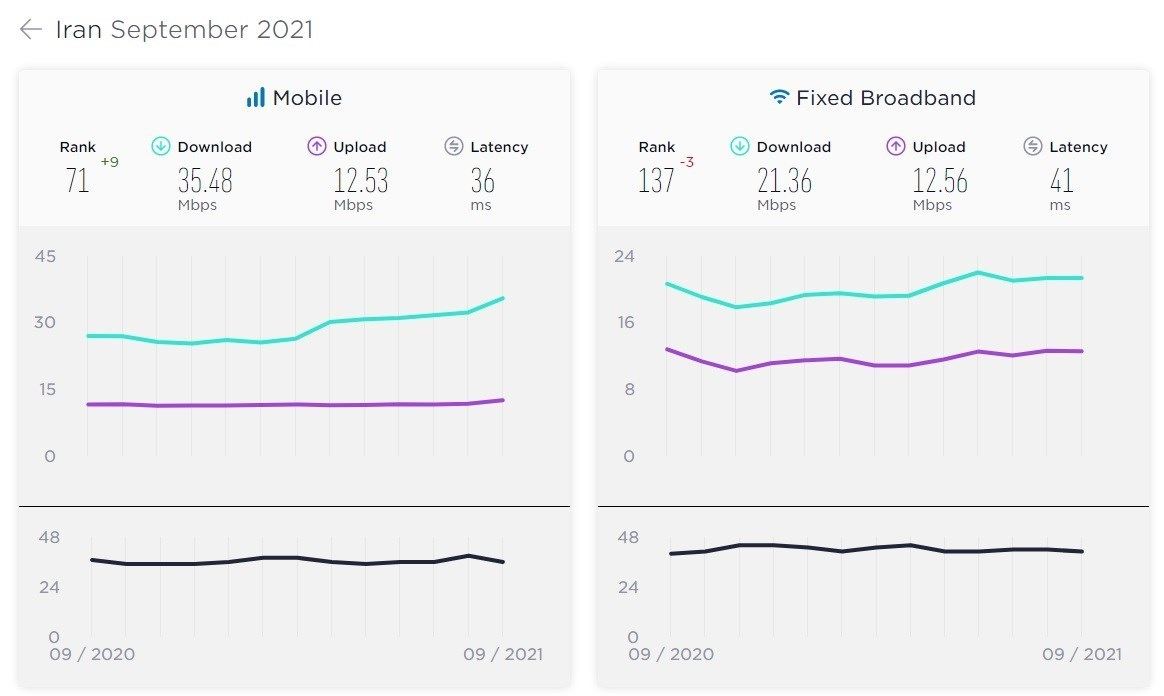 اسپیدتست ماهانه گزارشی درباره وضعیت سرعت اینترنت در کشورهای مختلف منتشر می‌کند و حالا طبق انتشار جدیدترین گزارش آن برای سپتامبر 2021، سرعت اینترنت ثابت در کشورمان تقریباً ثابت باقی مانده اما سرعت اینترنت موبایل با افزایش تقریباً چشمگیری نسبت به گزارش قبلی، از 35 مگابایت‌برثانیه عبور کرده است.