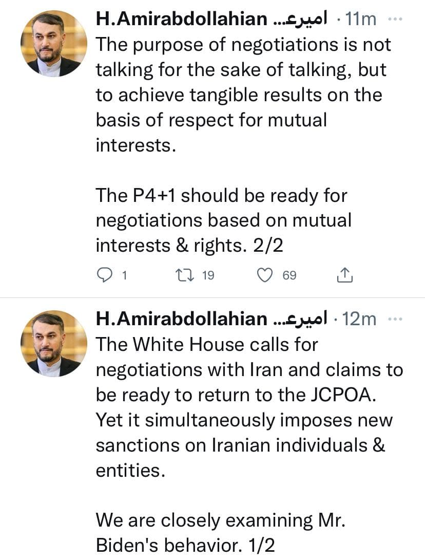 به گزارش سایت طلا،حسین امیرعبداللهیان در حساب توییتری خود نوشت: کاخ سفید درخواست مذاکره با ایران را مطرح می‌کند و ادعای آمادگی بازگشت به برجام را دارد ولی همزمان تحریم‌های جدید علیه افراد و شرکت‌های ایرانی اعمال می‌کند.