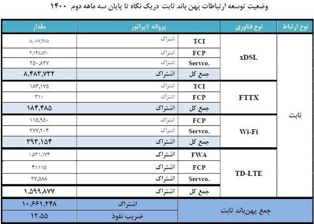 مشترکان خانگی و تجاری ارتباطات پهنباند ثابت که از فناوریهای اینترنت پرسرعت، شامل ADSL، VDSL، FTTX و TD-LTE استفاده میکنند، تا پایان سه ماهه دوم سال ۱۴۰۰، به ۱۰ میلیون و ۶۶۱ هزار مشترک رسیدهاند.