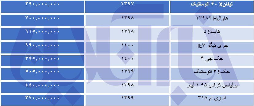 لیفان X۶۰ اتوماتیک مدل ۹۷، ۳۹۰ میلیون تومان خریدوفروش میشود و قیمت هاوال H۲ مدل ۹۸ به مرز ۷۰۰ میلیون تومان رسیده است.