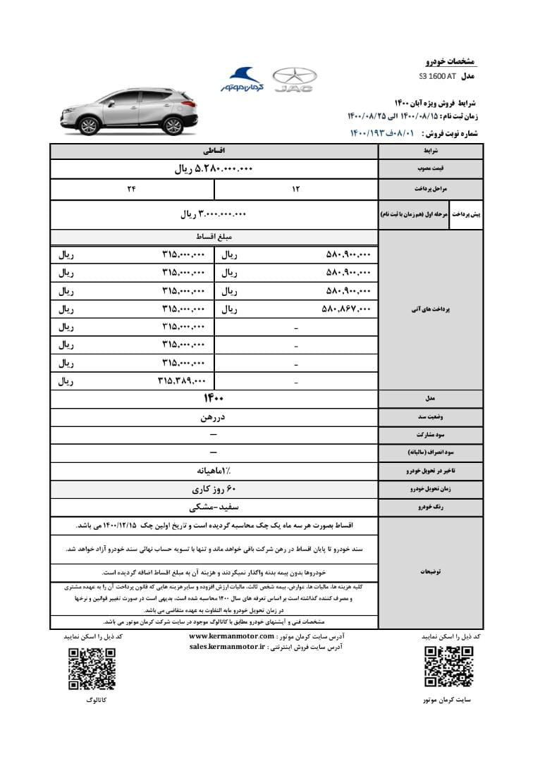 شرکت کرمان موتور در جدیدترین شرایط فروش جک s۳ امکان خرید اقساطی این خودرو را فراهم کرده است. این طرح فروش جک s۳ از تاریخ ۱۵ آبان شروع میشود و تا ۲۵ آبان ۱۴۰۰ ادامه دارد.