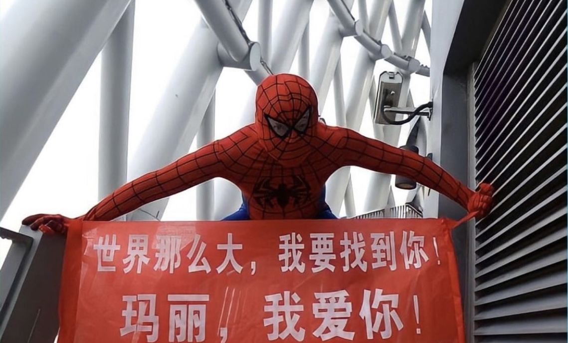 ایشون هم لباس مرد عنکبوتی میپوشه و از دیوار محل کار نامزدش میره بالا و تقاضای ازدواجشو با بنری که درست کرده بود اعلام میکنه !