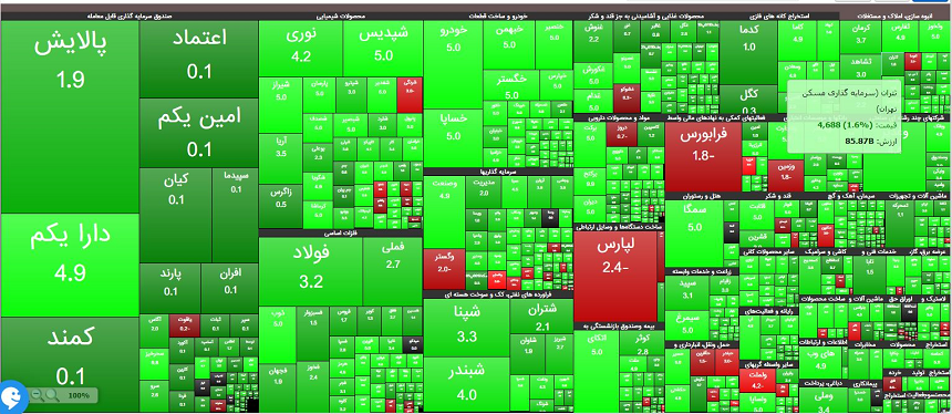 امروز همه شاخص‌های بورس سبز شدند که حاکی از افزایش همه شاخص‌ها دارد بگونه‌ای که شاخص کل و شاخص قیمت با معیار وزنی ـ ارزشی با رشد 3 درصدی همراه شدند.