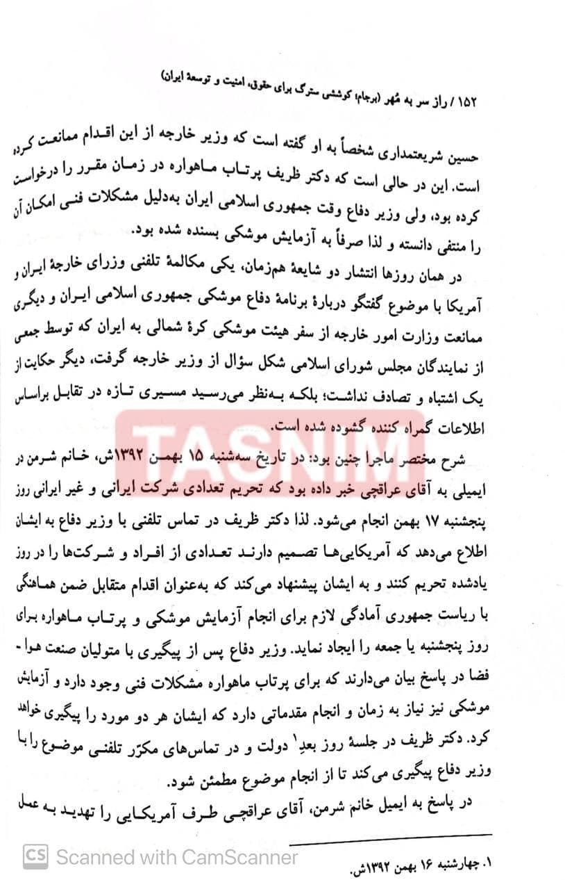 یکی از نکات جالب در این این کتاب -که در شش جلد ارائه شده- یک پاسخ، هرچند مختصر، به همین مدعای برخی حامیان دولت آقای روحانی است. در صفحه 152 این کتاب نکته بسیار مهمی نهفته است و آن اینکه آقای ظریف تاکید میکند برخلاف تبلیغات منتقدانش نه تنها از مذاکرات پلی برای تحدید قدرت موشکی ایران نساخته بلکه خود یکی از مدافعان انجام آزمایش موشکی، آنهم پس از توافق ژنو بوده است.
