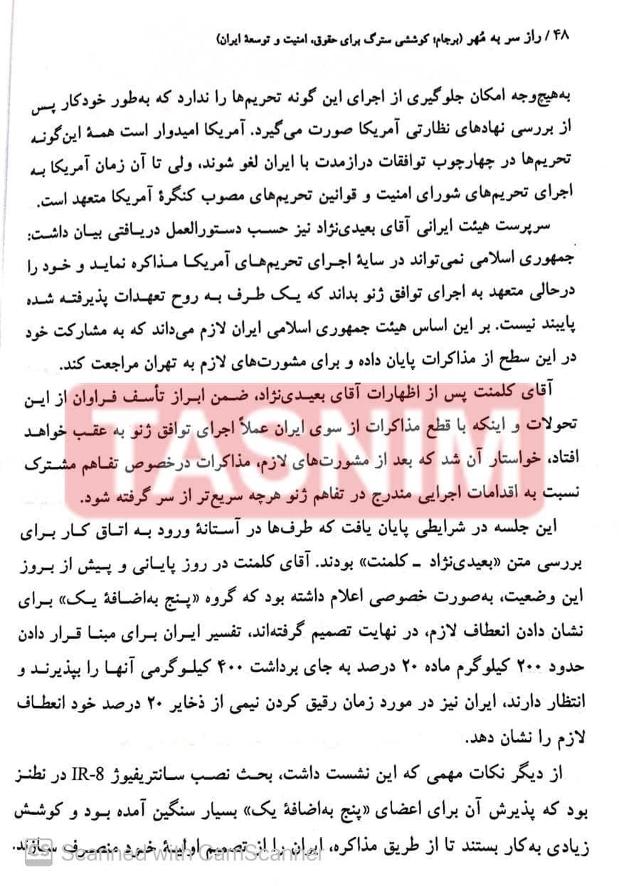از موضوعات مهم دیگری که در این کتاب به آن اشاره میشود آن است که آمریکاییها بلافاصله پس از توافق موقت ژنو و در حالی که هنوز مذاکرات چگونگی اجرای آن در جریان بود طرف آمریکایی تحریمهای دیگر را علیه ایران اعمال کرد که همین مسئله موجب شد وزارت خارجه کشورمان آقای بعیدینژاد که مشغول مذاکرات بود را به تهران بخواند و مذاکرات را در آن مقطع قطع کند.