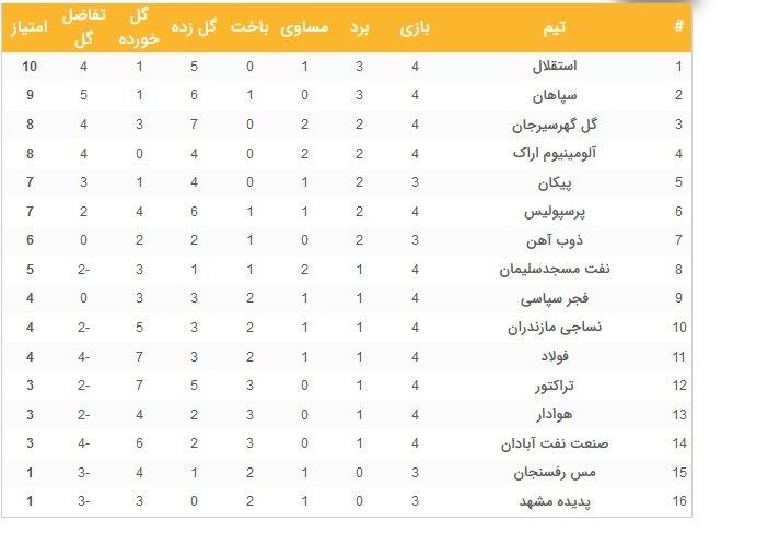 جدول لیگ برتر فوتبال در پایان هفته چهارم؛ همه چیز به کام استقلال