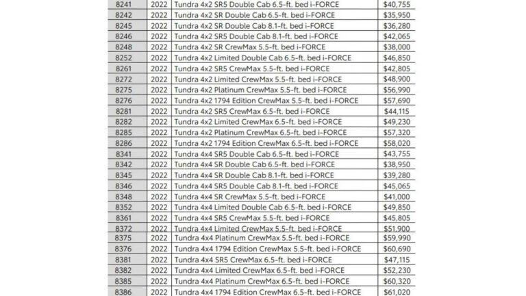 عددها برای «توندرا ۲۰۲۲» (Tondra 2022) بهعنوان رقیب «فورد اف-۱۵۰» (Ford F-150) از ۳۵ هزار و ۹۵۰ دلار بدون احتساب ۱۶۵۰ دلار هزینهی تحویل آغاز میشود و بنابراین ۱۹۲۵ دلار از مدل فعلی گرانتر تمام میشود. با توجه به تغییر به یک پلتفرم کاملا جدید، موتور توربوشارژر دوقلو و استفاده از سیستم تعلیق چندپیوندی در عقب، انتظار این افزایش قیمت میرفت.