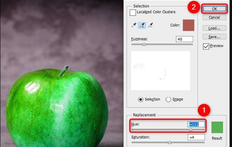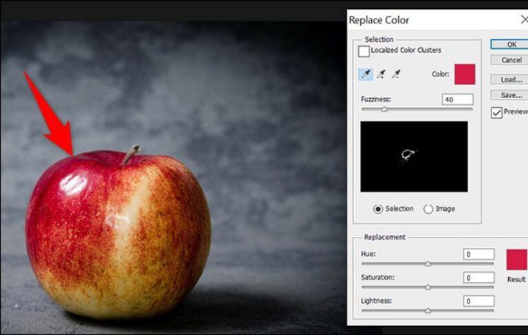 به پنجرهی «Replace Color» برگردید، «Hue» را بکشید تا رنگ مورد نظر روی شی خود را تنظیم کنید. وقتی همه چیز خوب به نظر میرسد، در پنجرهی «Replace Color»، روی «OK» کلیک کنید. و تمام. بنابراین ما توانستیم با ابزار Replace Color نرمافزار ادوبی فتوشاپ بهراحتی رنگ سیب را تغییر دهیم.