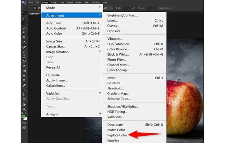 ابتدا عکس را با نرمافزار ادوبی فتوشاپ باز کنید. اگر چندین عکس دارید که میخواهید همزمان ویرایش کنید، میتوانید چندین تصویر را در یک سند باز کنید. در فتوشاپ، از نوار منو در بالا قسمت select Image > Adjustments > Replace Color را انتخاب کنید.