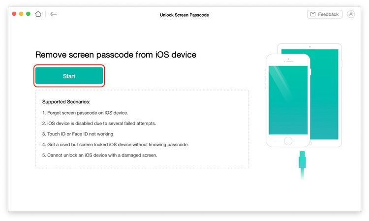 آیفون خود را از طریق کابل شارژ به رایانه متصل کرده و روی دکمه Start در اپلیکیشن اِنیآنلاک کلیک کنید.