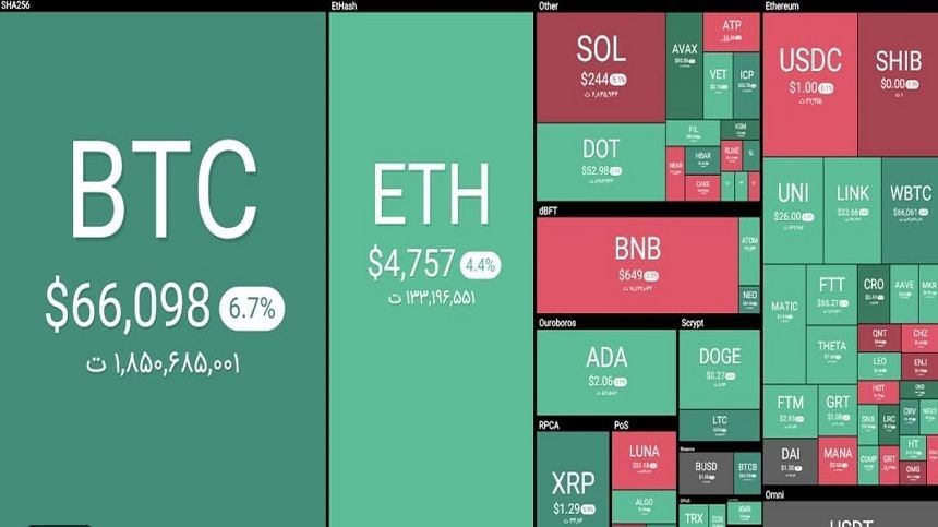 قیمت بیت کوین با یک افزایش 3 درصدی به 65121 دلار رسیده و اتر هم تا رکورد 4711 دلار بالا رفتهاست.
