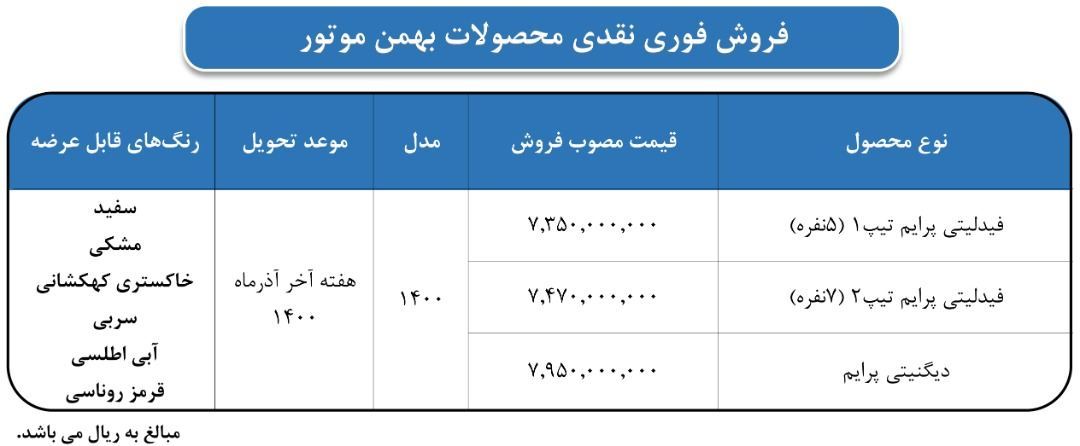فروش نقدی دیگنیتی و فیدلیتی ( ۵نفره و ۷ نفره ) بهمن موتور، ساعت ۱۰ صبح امروز دوشنبه مورخ ۱۷ آبان در سامانه فروش اینترنتی بهمن خودرو آغاز شده است و تا ساعت ۱۶ همان روز یا زمان تکمیل ظرفیت ادامه دارد.