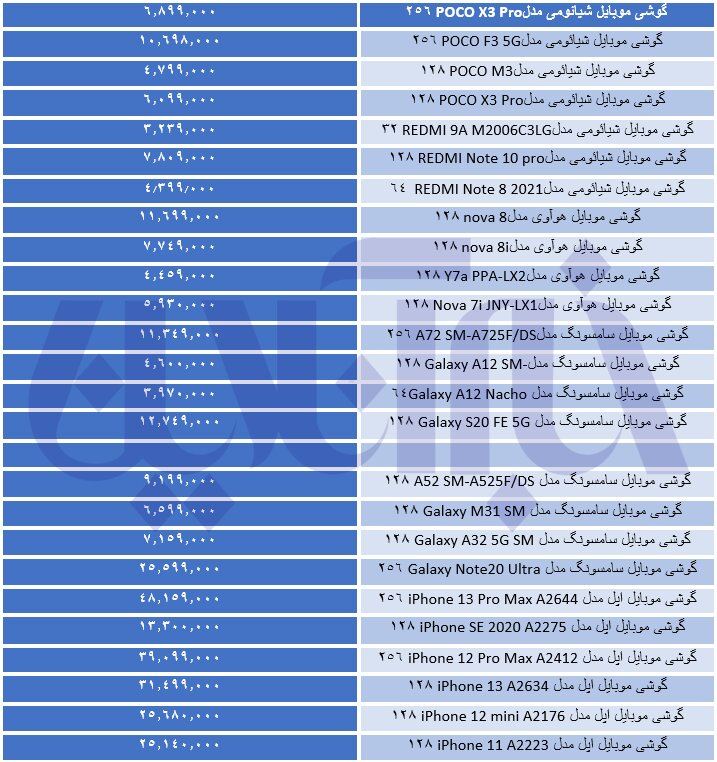 در بین تلفن های سامسونگ موجود در بازار نیز سامسونگ گلکسی آ۱۲ از ۴ میلیون و ۴۰ هزار تومان در هفته های گذشته امروز به ۴ میلیون و ۶۰۰ هزار تومان رسیده است و ساسونگ گلکسی آ۳۲ نیز از ۶ میلیون و ۷۲۰ هزار تومان امروز به ۷ میلیون و ۱۵۹ هزار تومان رسیده است.