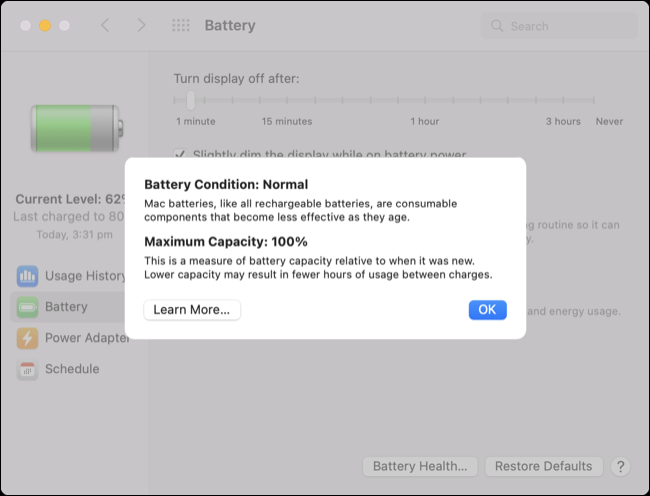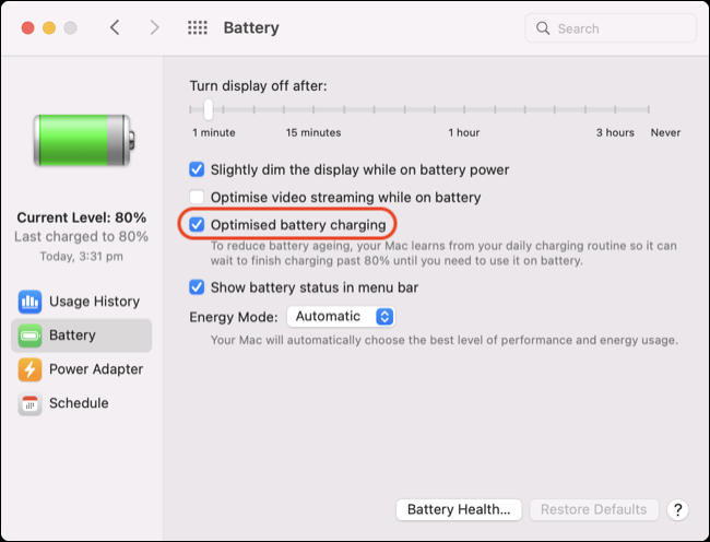 در نتیجه توصیه میشود تا کاربران برای اطمینان از بهبود عمر باتری مک بوک اقدام به فعالسازی حالت شارژ بهینه در دستگاه خود کنند. برای انجام این کار ابتدا به System Preferences مراجعه کنید و سپس در ابتدا گزینه Battery را زده و دوباره از منوی سمت چپ، Battery را انتخاب کنید. زمانی که دستگاه اقدام به شناسایی عادتهای کاربر کند، از شارژ بیش از حد و کامل در مواقع غیرضروری خودداری میکند. قابلیت مذکور برای اولین بار در مک اواس کاتالینا در دسترس قرار گرفت؛ پس اگر از نسخههای قدیمیتر این سیستم عامل استفاده میکنید، گزینههای گفته شده را مشاهده نخواهید کرد.