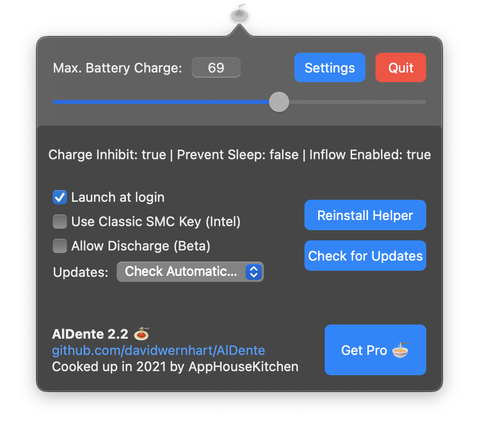 اگر میخواهید بیشترین میزان استفاده از باتری مک بوک خود را داشته باشید، میتوانید از برنامههای جانبی مدیریت باتری بهره بگیرید. AlDente یکی از عناوین رایگان در همین زمینه است که امکان تنظیم محدودیت برای شارژ دستگاه و قطع کردن خودکار را فراهم میکند. به صورت پیشفرض حداکثر میزان شارژ روی ۸۰ درصد تنظیم شده است.