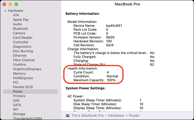 برای دسترسی به جزئیات بیشتر از جمله تعداد چرخههای شارژ سپری شده، روی لوگوی اپل در گوشه بالایی سمت چپ کلیک کنید و در صفحه باز شده، گزینه About This Mac را انتخاب نمایید. در ادامه System Report را از تب Overview انتخاب کنید. اکنون به پایین صفحه بروید تا به قسمت Power برسید. در زیر عنوان Health Information قادر خواهید بود تا تعداد چرخههای شارژ سپری شده در کنار اطلاعات دیگر را مشاهده نمایید.