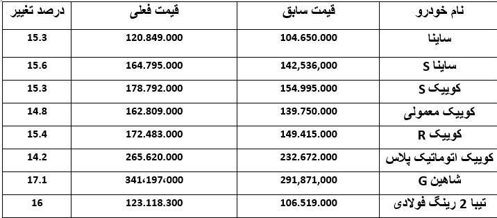بر اساس این گزارش،قیمت های جدید خودروهای سایپا در مقایسه با قیمت های قبلی بین 14 تا 17 درصد افزایش داشته که جزئیات آن در جدول زیر قابل مشاهده است: (قیمت به میلیون تومان)