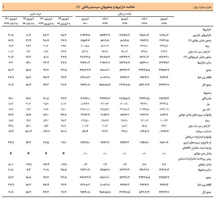 براساس جدول آماری منتشر شده میزان دارایی و بدهی سیستم بانکی در شهریورماه به ۹ هزار و ۱۷۴ هزار میلیارد تومان رسید. میزان دارایی خارجی بانکها نیز در این دوره ۲هزار و ۴۶ هزار میلیارد تومان و میزان بدهی بخش دولتی ۶۵۵ هزار میلیارد تومان بود.