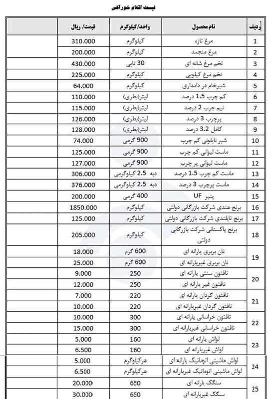 پیرو این مصوبه قیمت 25 کالای اساسی به شرح زیر اعلام شد: