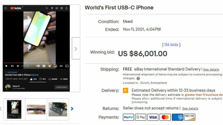مدتی قبل یک دانشجوی رشتهی مهندسی رباتیک از ساخت اولین آیفون مجهز به پورت USB-C خبر داد و سپس آن را برای فروش در سایت eBay گذاشت و در نهایت با قیمت ۸۶۰۰۱ دلار فروخته شده است.