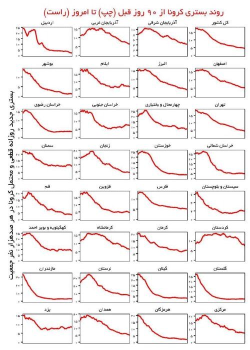 به گزارش سایت طلا از وبدا، روند بستری در اکثر استانهای کشور از ۹۰ روز حاکی از آن است که اکنون روند بستری در استانهای کشور پایدار یا کاهشی است. فقط استان کرمان در هفت روز گذشته افزایش موارد بستری را نسبت به هفته قبل تجربه کرد همچنین روند پذیرش بیماران سرپایی هم پایدار است.