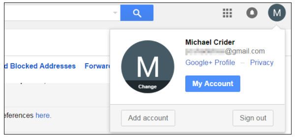 هنگامی که وارد حساب جیمیل خود شدید، با کلیک روی تصویر نمایه خود (اگر آن را تنظیم نکرده اید، فقط اولین حرف نام شماست) در گوشه بالا سمت راست، به صفحه تنظیمات حساب گوگل بروید و سپس My Account را بزنید.