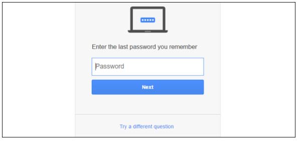 شروع فرآیند بازیابی رمز عبور بسیار آسان است: فقط روی پیوند « forgot password» در صفحه ورود به سیستم جیمیل کلیک کنید. سپس پیامی به شما نشان داده می شود که از شما می خواهد آخرین رمز عبوری را که می توانید به خاطر آوریدوارد کنید. اگر بتوانید رمز عبور صحیح را به خاطر آورید از شما خواسته می‌شود به روش‌های مختلفی ادامه دهید. اگر نمی توانید هیچ یک از آنها را به خاطر بسپارید، روی " try a different question" کلیک کنید.