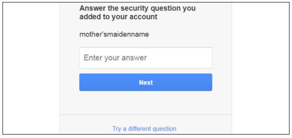 اگر به حسابی که در ابتدا به عنوان پشتیبان تعیین کرده‌اید نیز دسترسی ندارید؛ دوباره روی « try a different question» کلیک کنید. اکنون به روش‌های قدیمی‌تر و کم‌ایمن‌تر برای محافظت از حساب، مانند سؤالات امنیتی مانند «نام مادرت چیست» می‌رسیم. شما باید بتوانید حداقل یکی از این موارد را پاسخ دهید.