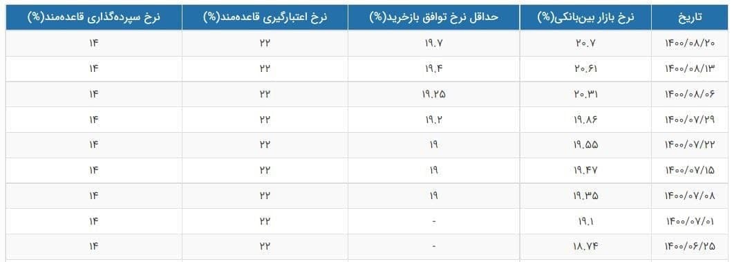 بانک مرکزی نرخ سود بین بانکی را 20.7 درصد اعلام کرد و حداقل نرخ توافق بازخرید را به 19.7 درصد رساند.