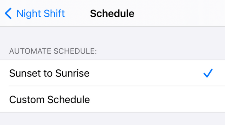 برخی از افراد دوست دارند که ویژگی Night Shift روی تلفن همراه آن‌ها، با غروب آفتاب روشن و با طلوع آفتاب خاموش شود. به همین دلیل، آیفون یک گزینه مختص این افراد طراحی کرده و در بخش schedule قرار داده‌است. شما برای استفاده از این گزینه، تنها باید در بخش schedule روی Sunset to Sunrise کلیک کنید.