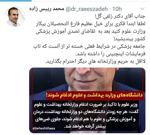 دکتر محمد رییسزاده در پیامی توییتری نوشت:« جناب آقای دکتر زلفی گل!