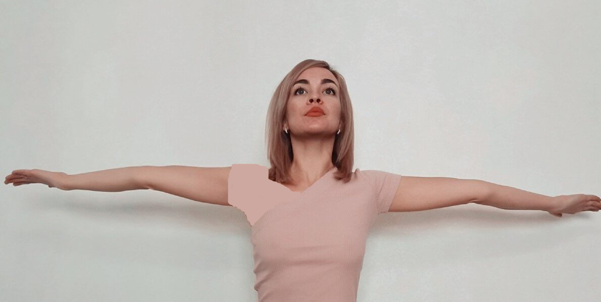 1.صاف بایستید و پاها را به اندازه عرض شانه باز کنید. بازوهای خود را به طرفین دراز کنید، کف دست ها به سمت بالا